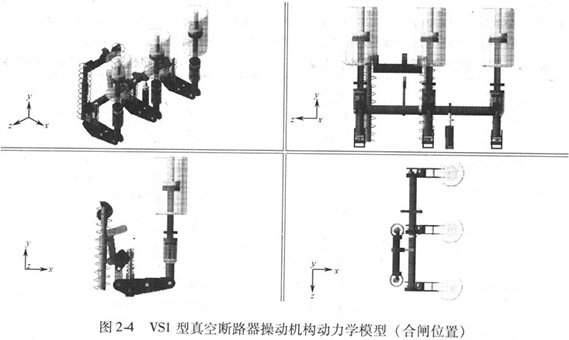 利用ADAMS建立的VS1型真空斷路器操動(dòng)機(jī)構(gòu)動(dòng)力學(xué)模型如圖2-4所示,圖中左上、右上、左下、右下分別為軸測(cè)圖、右視圖、正視圖和頂視圖。圖2-5所示為模型的放大圖形。