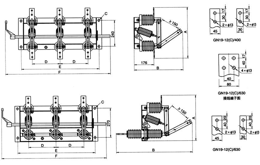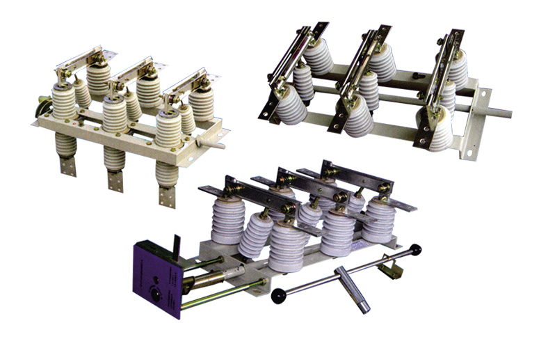 本隔離開關(guān)為三極型,由底架、轉(zhuǎn)軸、及杠桿、瓷支柱絕緣子、閘刀及接線板等部分組成。轉(zhuǎn)軸安置在底架上,其上焊有三對(duì)杠桿,杠桿通過(guò)拉桿瓷絕緣子與閘刀相連。轉(zhuǎn)軸伸出底架,其任何一段均可與操作機(jī)構(gòu)相連。